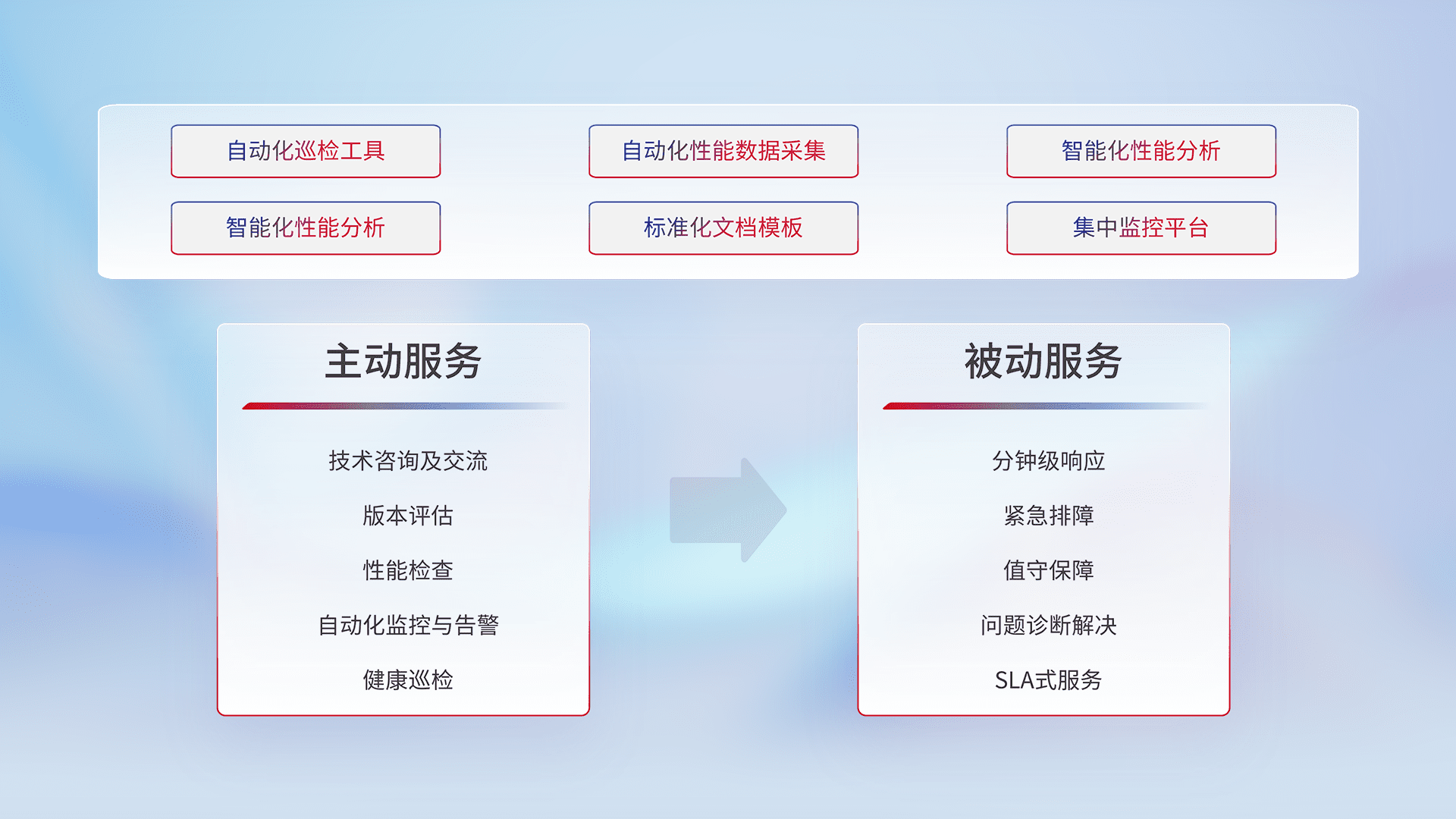 智能化工具和标准化文档,,保障服务质量,,,,提供主动服务(包含技术咨询、、、版本评估、、、、性能检查、、自动化监控与告警、、健康巡检)和被动服务包含(分钟级响应、、、、紧急排障、、、值守保障、、问题诊断解决、、、SLA服务)。。